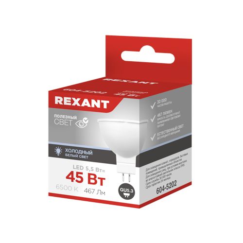 Производитель: Rexant Наименование: Энергосберегающая светодиодная лампа Эквивалент накаливания: 45 Вт Мощность: 5.5 Вт Источник света: LED Световой поток: 467 лм Коэффициент цветопередачи: Ra>85 Цветность: 6500 К (холодный белый свет) Тип колбы: MR16 Цоколь: Gu5.3 Ресурс работы: 30 000 ч Рабочая температура: -20° до +40°С Рабочее напряжение: 220 - 240В Размеры: 50 х 45 мм