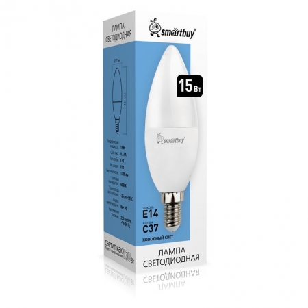 Производитель: Smartbuy Наименование: Энергосберегающая светодиодная лампа Потребляемая мощность: 15 Вт Эквивалент накаливания: 130 Вт Источник света: LED Световой поток: 1200 лм Коэффициент цветопередачи: Ra>80 Цветность: 6000 К (холодный дневной свет) Тип колбы: С37 Цоколь: Е14 Ресурс работы: до 30 000 ч Рабочая температура: -25° .. +50°С Рабочее напряжение: 210 - 240В Цвет колбы: Белый/матовый Диаметр: 37 мм Размеры: 110 x 37 мм