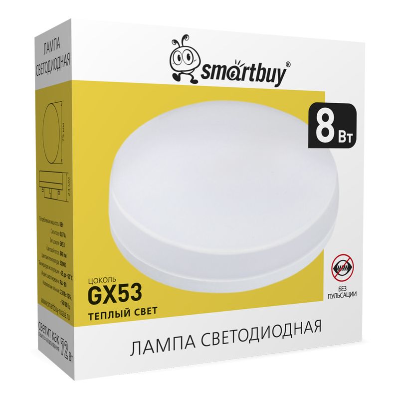 Smartbuy GX53 - светодиодная энергосберегающая лампа с матовым рассеивателем, предназначена для общего, локального и декоративного освещения. Лампа с цоколем GX53 выполнена в форме цилиндра, она идеально подходит к любому светильнику, в котором используются данный типы ламп. Матовая поверхность колбы обеспечивает равномерную освещенность и защищает глаза от слепящего света. Отсутствие мерцания и бесшумная работа позволяют говорить о высоком качестве изделий, рассчитанных минимум на 30 тысяч часов работы. Не содержит ртуть, экологически безопасна.