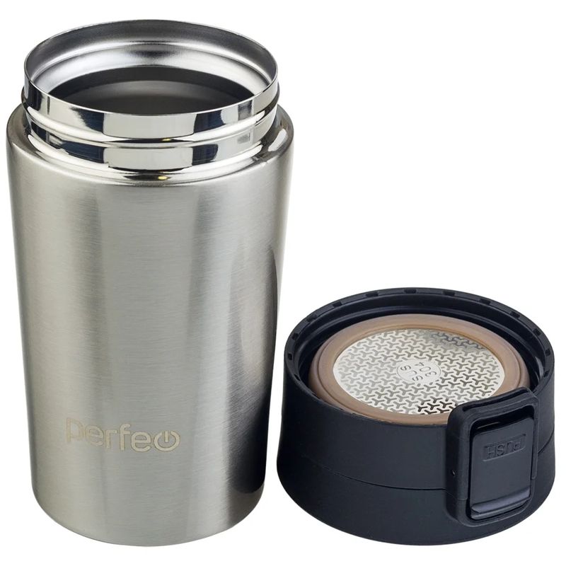 Производитель: Perfeo Наименование: Термокружка Особенности: Крышка-поилка, ситечко, кнопка открывания крышки с блокировкой Материал корпуса: Высококачественная нержавеющая сталь Объем: 0.35 л Цвет: Серебристый/черный Вес: 260 г