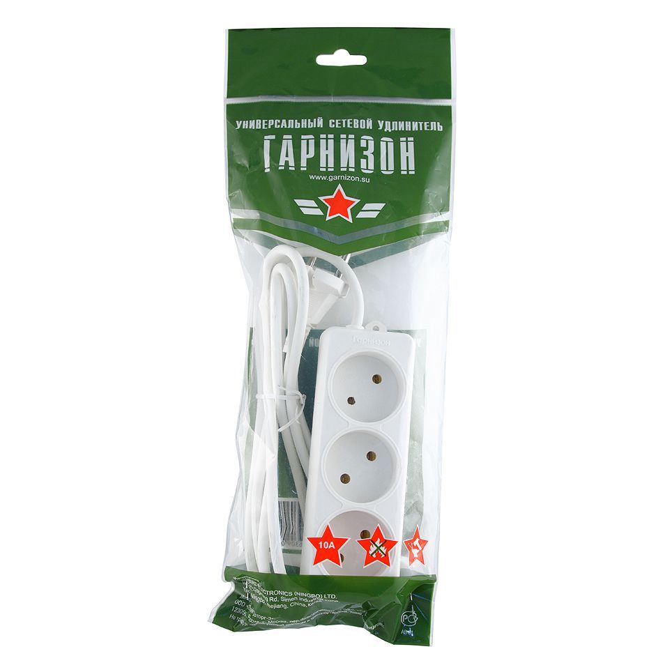 Производитель: Гарнизон Тип устройства: Сетевой удлинитель Номинальное напряжение: 220 В Максимальная нагрузка: 2200 Вт Номинальный ток нагрузки: 10 А Выходные розетки: 3 Кабель: ПВС 2 х 0.75 Длина кабеля: 3 м Материал корпуса: Негорючий пластик Цвет: Белый