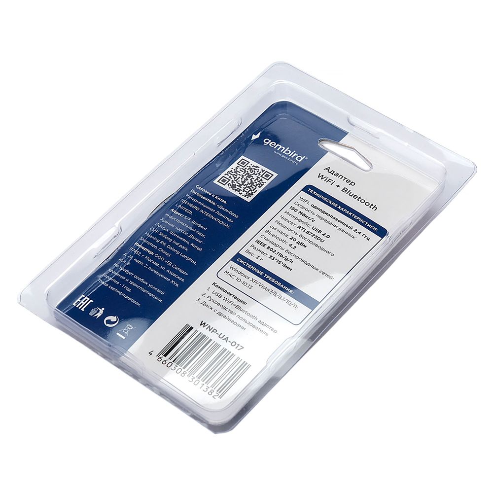 Gembird WNP-UA-017 - компактный WiFi-адаптер с поддержкой Bluetooth 4.2. Обеспечивает подключение к сети WiFi на частоте 2.4 ГГц, а также позволяет подключать периферийные Bluetooth устройства. Скорость передачи данных до 150 Мбит/с.