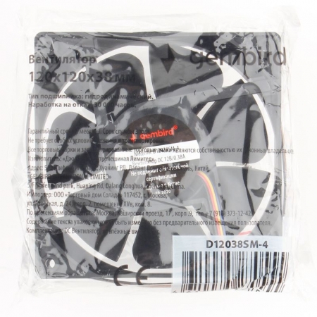 Вентилятор 120 х 120 х 38 мм, Gembird D12038SM-4. Питается от 12В, имеет датчик оборотов и возможность управления количеством оборотов. Подключается к 4-pin коннектору.