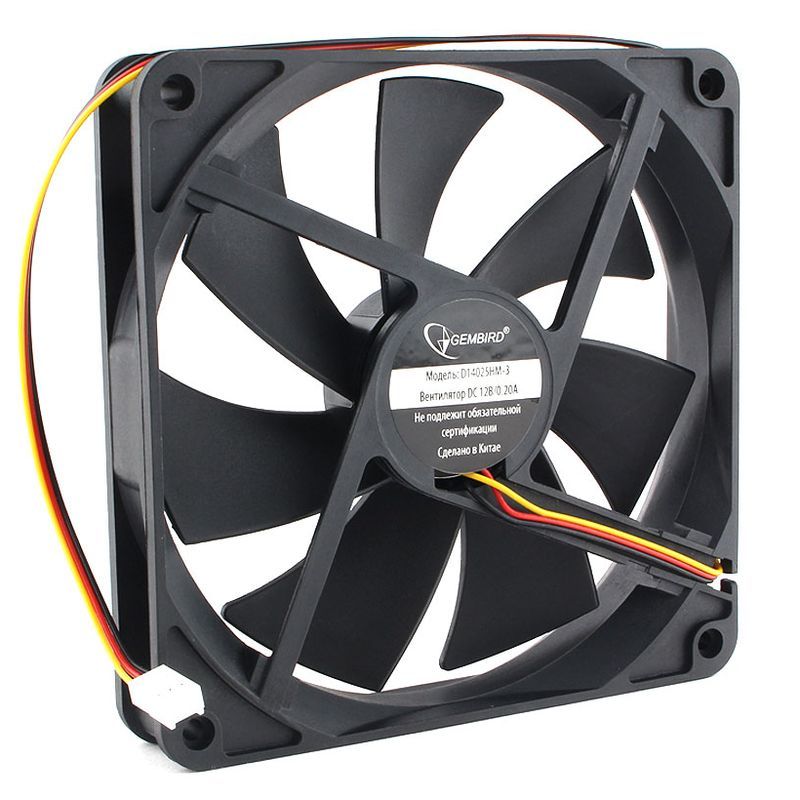 Вентилятор 140 х 140 х 25 мм, Gembird D14025HM-3. Питается от 12В, подключается к 3-pin коннектору. Имеет датчик оборотов. Благодаря использованию гидродинамического подшипника вентилятор обладает пониженным уровнем шума и увеличенным ресурсом работы.
