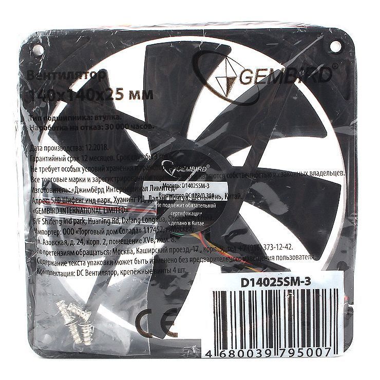 Вентилятор 140 х 140 х 25 мм, Gembird D14025SM-3. Питается от 12В, подключается к 3-pin коннектору.