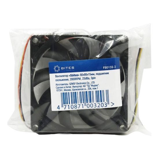 Вентилятор 80 х 80 х 15 мм, 5bites F8015S-3. Вентилятор питается от 12В, имеет датчик оборотов и подключается к 3-pin коннектору.