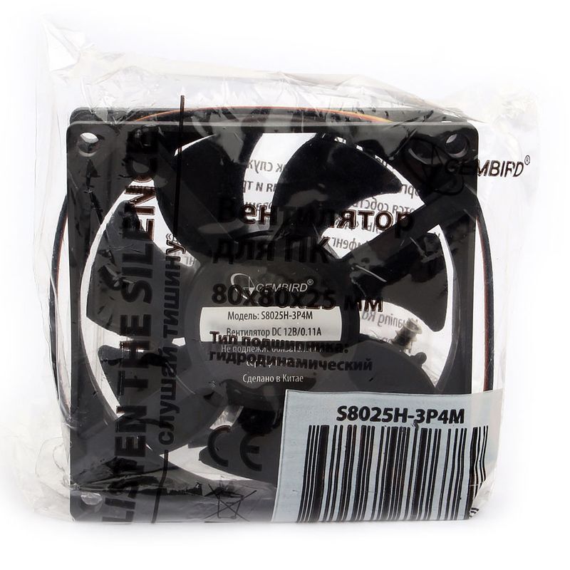 Вентилятор Gembird S8025H-3P4M, 80 x 80 x 25 мм. Питается от 12В, подключается к 3-pin коннектору или 4 pin Molex. Оснащен датчиком оборотов. Скорость вращения 2000 оборотов в минуту. Благодаря использованию гидродинамического подшипника вентилятор обладает пониженным уровнем шума. В комплект входят: переходник питания, резиновые и металлические винты. Технические характеристики