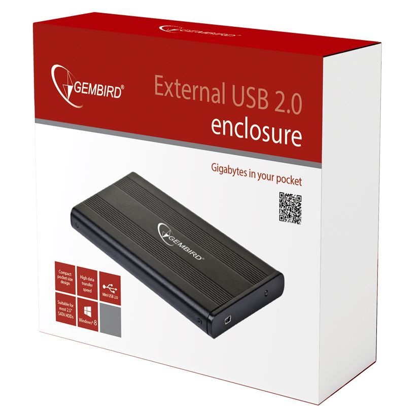 Производитель: Gembird Наименование: Внешний контейнер для жесткого диска Форм-фактор: 2.5" Интерфейс поддерживаемых HDD: SATA Интерфейс: USB 2.0 (обратно совместим с USB 1.1) Скорость передачи данных: До 30 МБ/сек Совместимость с ОС: WIndows XP/Vista/7/8, MAC OS 8.6 и выше Индикация: LED-индикатор Разъемы: miniUSB Питание: От USB Материал корпуса: Алюминий/пластик Цвет: Черный Размеры: 127 x 75 x 13 мм Вес: 58 г