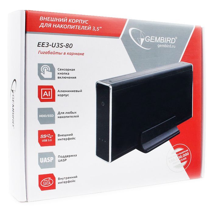 Внешний контейнер Gembird EE3-U3S-80 предназначен для 3.5" SATA жестких дисков. Устройство поддерживает высокоскоростной интерфейс USB 3.0, обеспечивающий скорость передачи данных до 5 Гбит/сек. Использование протокола UAS на 20 % повышает скорость передачи данных по сравнению с протоколом USB Mass Storage, 1 Гб за 10 секунд. Контейнер оснащен сенсорной кнопкой включения и LED-индикатором, отображающим статус работы. Имеет функцию "автостоп" для HDD и SSD. Прочный корпус из алюминия эффективно отводит тепло и надежно защищает жесткий диски от повреждений. В комплект входит подставка для установки жесткого диска на столе, USB-кабель, блок питания и небольшая отвертка.