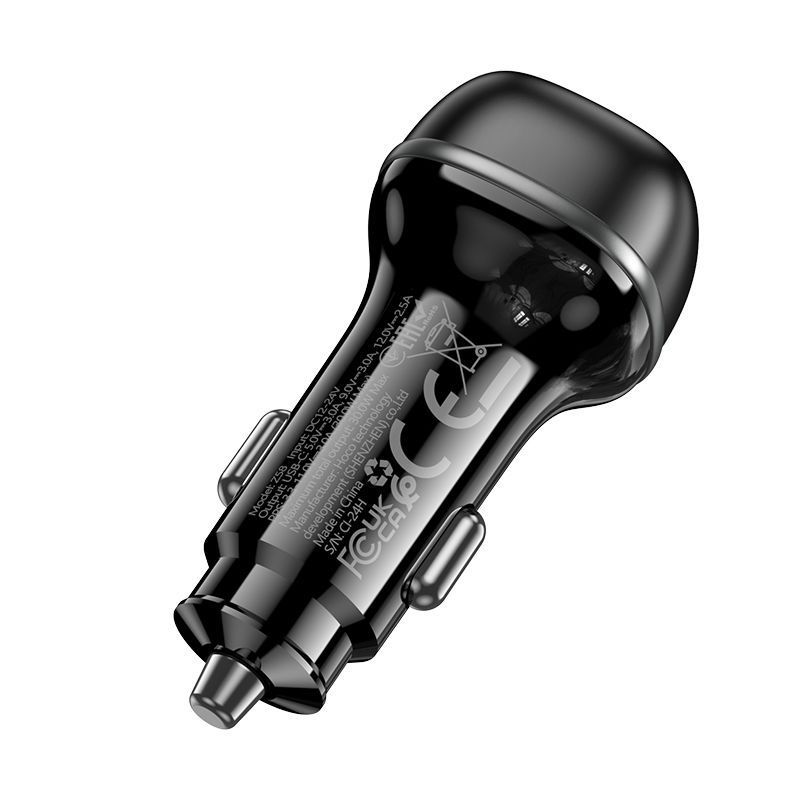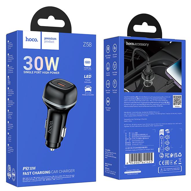 Hoco Z58 - автомобильное зарядное устройство с поддержкой стандартов быстрой зарядки QC3.0, PD, FCP, AFC. Предназначено для зарядки портативной техники от прикуривателя с напряжением бортовой сети 12-24В. Адаптер обладает мощностью 30 Вт и оснащен портом USB-C. В нем предусмотрена автоматическая регулировка напряжения и силы тока, что делает процесс зарядки быстрым и безопасным. Также имеется многоуровневая защита от короткого замыкания, перегрузки по току, перенапряжения и перегрева. Корпус зарядного устройства изготовлен из ударопрочного и термостойкого пластика.
