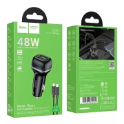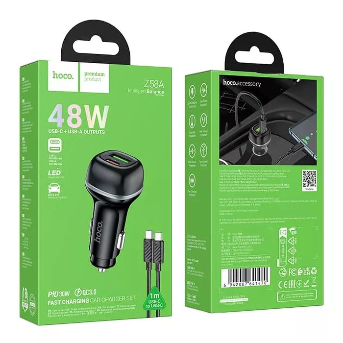 Hoco Z58A - автомобильное зарядное устройство с поддержкой стандартов быстрой зарядки QC3.0, PD, FCP, AFC. Предназначено для зарядки портативной техники от прикуривателя с напряжением бортовой сети 12-24В. Адаптер обладает мощностью 48 Вт, оснащен портами USB-A и USB-C. В нем предусмотрена автоматическая регулировка напряжения и силы тока, что делает процесс зарядки быстрым и безопасным. Также имеется многоуровневая защита от короткого замыкания, перегрузки по току, перенапряжения и перегрева. Корпус зарядного устройства изготовлен из ударопрочного и термостойкого пластика. В комплект входит кабель Type C длиной 1 метр.