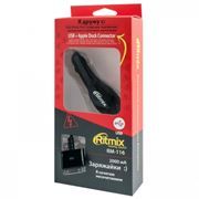 Ritmix RM-117 автомобильное зарядное устройство с интерфейсом USB, имеющее проводное подключение типа Apple Dock Connector (для электроники Apple) и два стандартных USB-порта. Модель оснащена индикатором подключения к бортовой сети автомобиля.