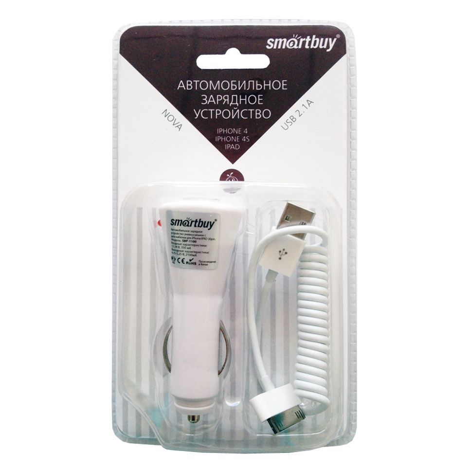 Зарядное устройство SmartBuy NOVA предназначено для подзарядки iPhone4/iPad и USB-устройств от автомобильного прикуривателя. Модель оснащена USB-портом с током заряда 2.1А, что позволяет заряжать