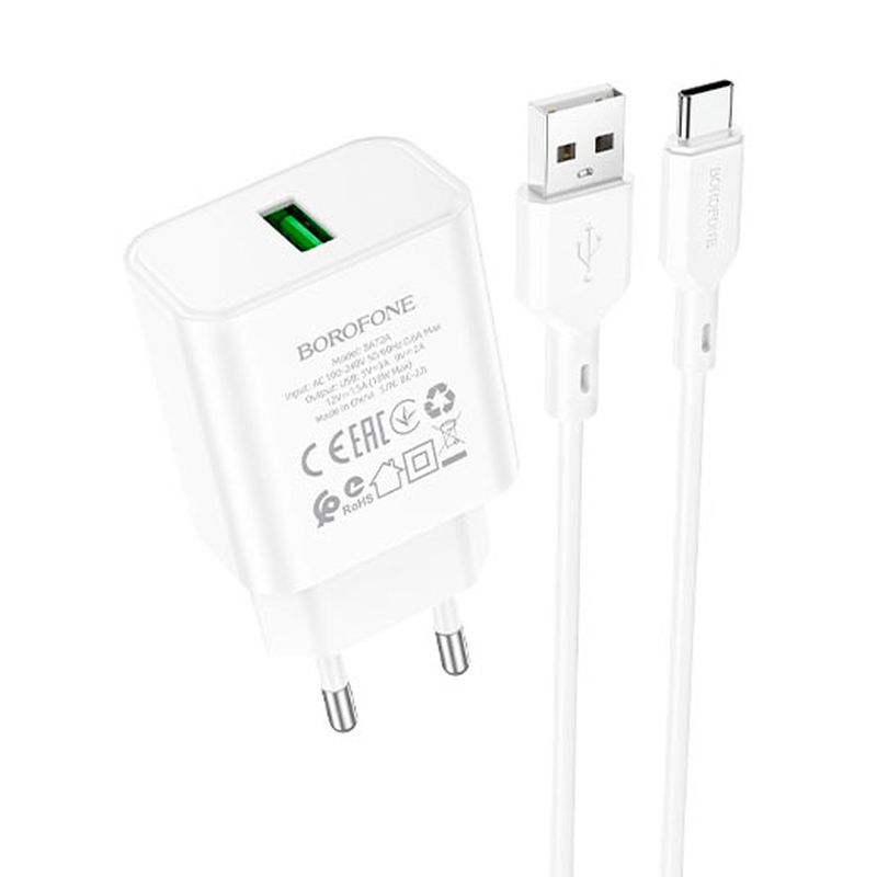 Высокоскоростное зарядное устройство Borofone BA72A Spring предназначено для зарядки мобильной техники от сети с напряжением 100-240В. Адаптер оснащен одним USB портом, поддерживает стандарты быстрой зарядки QC3.0/QC 2.0, Huawei FCP и Samsung AFC. Также его можно использовать для зарядки обычных USB-устройств. Многоуровневая защита от короткого замыкания, перенапряжения, скачков напряжения, перегрева и перезаряда помогает обезопасить подключенные устройства от поломки. Borofone BA72A Spring изготовлен корпусе из термостойкого и ударопрочного пластика. В комплект входит кабель Type C длиной 1 метр.