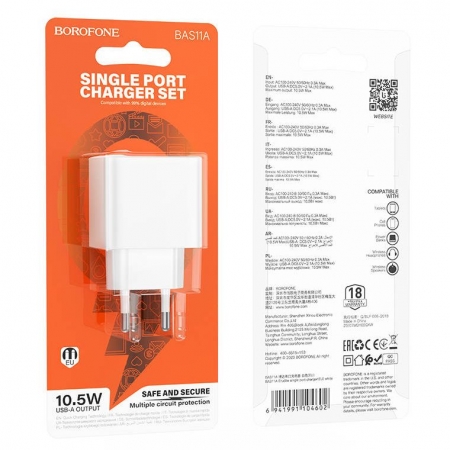 Производитель: Borofone Наименование: Сетевое зарядное устройство Входное напряжение: 100-240В 50/60 Гц Выходное напряжение: 5В Выходной ток: 2.1А (макс.) Максимальная мощность: 10.5 Вт Кол-во USB-портов: 1 Защита: От перенапряжения, перегрузки и перегрева Материал корпуса: Термостойкий противоударный пластик Цвет: Белый Размеры: 74 x 40 x 30 мм