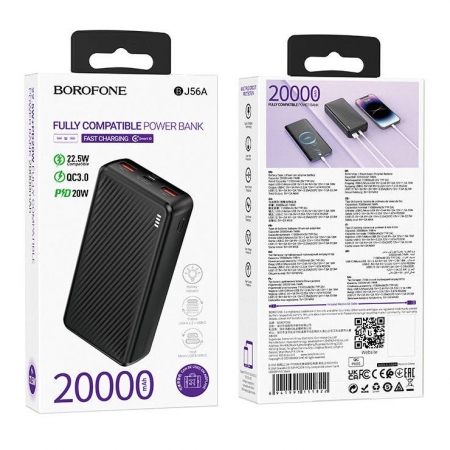 Внешний аккумулятор Borofone BJ56A Graceful с поддержкой стандартов быстрой зарядки PD 20W, QС3.0/2.0, FCP, AFC, SCP. Устройство оснащено литий-полимерной батареей емкостью 20000 мАч, двумя выходными портами USB-A и портом USB-C. Для зарядки повербанка используется вход Type C или Micro USB, поддерживающие быструю зарядку. Контроль за уровнем заряда аккумулятора осуществляется с помощью светодиодного индикатора.