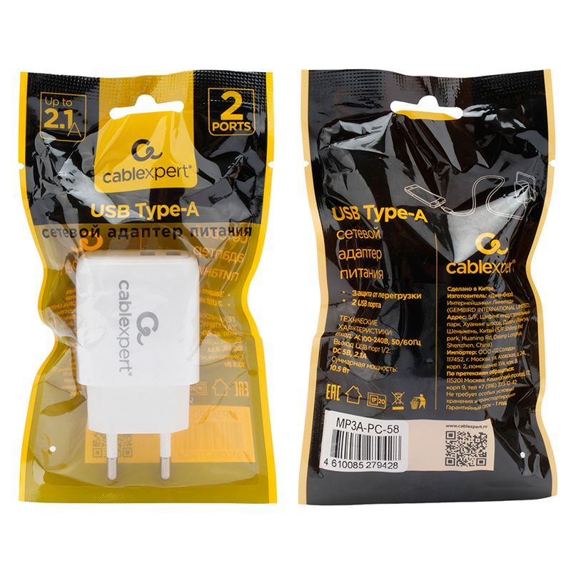 Главная / Электропитание / Блоки питания и зарядные устройства / Сетевые зарядные устройства / Зарядное устройство Cablexpert MP3A-PC-58 100/220V->5V, 2.1A 2xUSB, белое