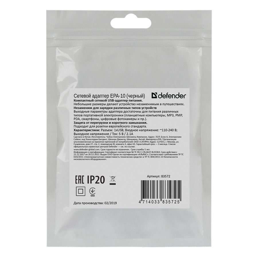Зарядное USB-устройство Defender EPA-10 предназначено для зарядки портативной техники (MP3 плееры, смартфоны, планшетные компьютеры, цифровые фотокамеры) от электросети 110-240 В. Модель оснащена одним USB-портом с максимальным выходным током 2.1 А. Защита от перегрузки и короткого замыкания помогает обезопасить заряжаемое устройство в случае возникновения каких-либо проблем в сети. Компактные размеры делают устройство незаменимым в путешествиях.