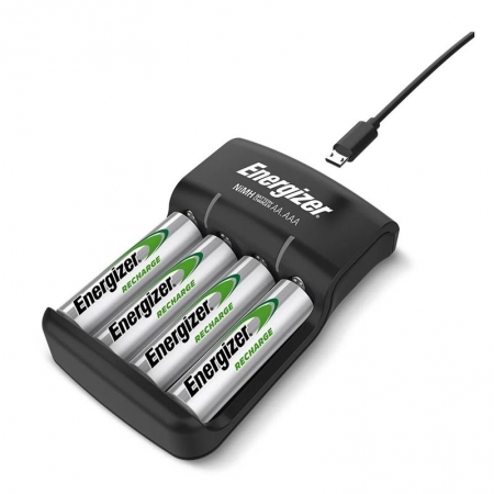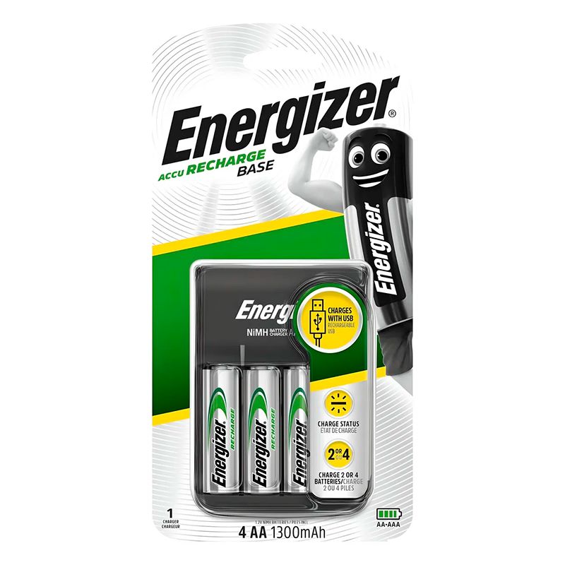 Energizer Base Charger - компактное зарядное устройство для аккумуляторов AA и AAA. Безопасная зарядка аккумуляторов AA и AAA за 5-12 часов. Модель не имеет таймера, контроль за процессом зарядки осуществляется пользователем. Работает от порта USB. В комплект входят 4 аккумулятора AA 1300 мАч.