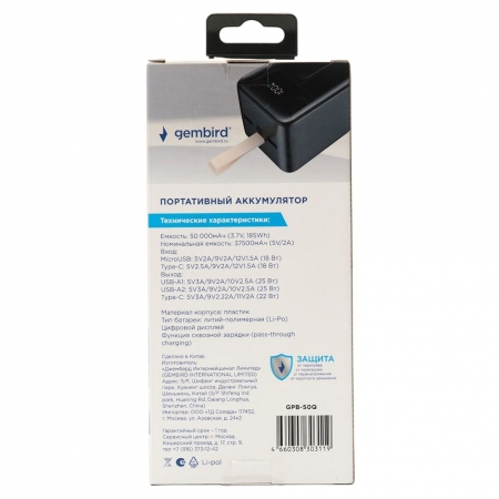Внешний аккумулятор Gembird GPB-50Q обеспечит мобильную технику необходимым резервным питанием во время поездок и путешествий. Устройство оснащено литий-полимерной батареей емкостью 50000 мАч и поддерживает стандарты быстрой зарядки QC/PD/FCP/SCP/AFC. Благодаря двум USB-выходам и выходу USB-C вы сможете заряжать 3 устройства одновременно. Для зарядки повербанка имеются два входа Micro USB и USB C. Функция сквозной зарядки (pass-through charging) позволяет одновременно заряжать повербанк и подключенное устройство. Контроль за уровнем заряда аккумулятора осуществляется с помощью цифрового дисплея. Корпус выполнен из ударопрочного пластика и имеет удобный подвес. Технические характеристики