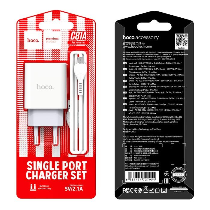 Производитель: Hoco Наименование: Сетевое зарядное устройство Входное напряжение: 100-240В 50/60 Гц Выходное напряжение: 5В Выходной ток: 2.1А (макс.) Мощность: 10.5 Вт Кол-во USB-портов: 1 Защита: От перенапряжения, перегрузки и перегрева Длина кабеля: 1 м Материал корпуса: Термостойкий противоударный пластик Цвет: Белый Размеры: 83 x 42 x 25 мм