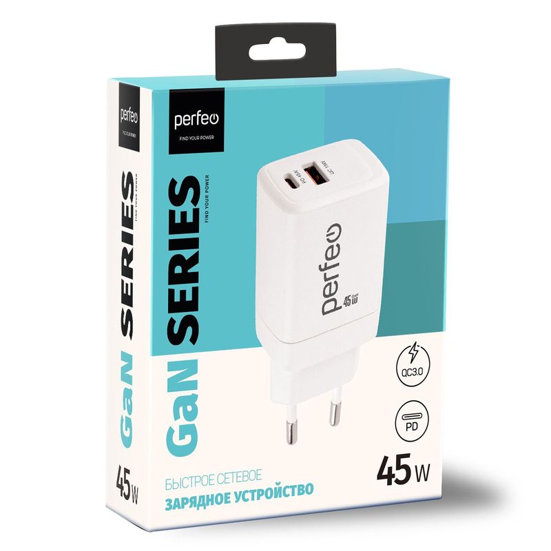 Зарядное устройство Perfeo I4663, QC/PD 45W, GaN, USB-A+C, белое