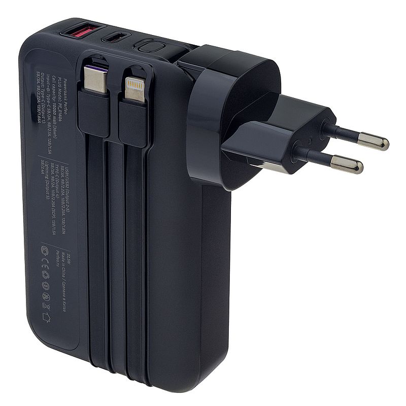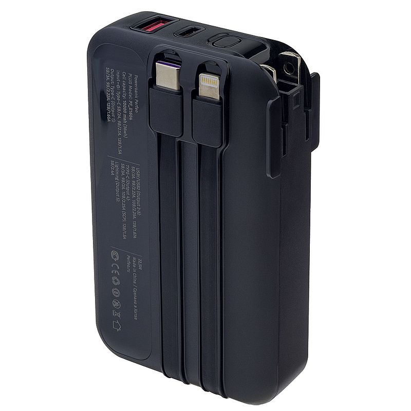 Perfeo Powerbank Plug - удобный повербанк со встроенной вилкой для подключения к сети 110-220В. Вам больше не нужно носить зарядку, повербанк и провода к ним. Все это есть у Powerbank Plug. Выходы Type-C и USB обеспечат быструю зарядку ваших устройств с поддержкой QC3.0. и PD 22.5W. Также имеется встроенный кабель Lightning для зарядки устройств Apple. Вы можете одновременно заряжать и сам повербанк и устройство благодаря функции сквозной зарядки. Цифровой дисплей поможет контролировать процесс зарядки устройства.