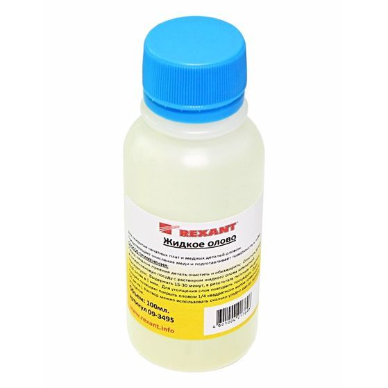 Жидкое олово (химическое лужение плат) Rexant предназначено для покрытия печатных плат и медных деталей оловом. В результате химического лужения поверхностей и деталей предотвращается окисление меди и поверхность готова к пайке. Один пузырек 100 мл позволяет покрыть оловом 1/4 квадратного метра поверхности (25 дм.кв.). Раствор можно использовать сколько угодно раз до полного истощения.