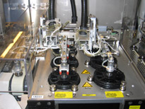 После охлаждения, готовые диски проходят проверку на финальном сканере, где происходит окончательное выявление дефектов. Обе стороны диска проверяются одновременно, и дополнительно производится измерение степени деформации готового диска. Прошедший проверку диск, перекладывается на шпиндель ресивера-накопителя, не прошедший - на шпиндель бракованных дисков. |